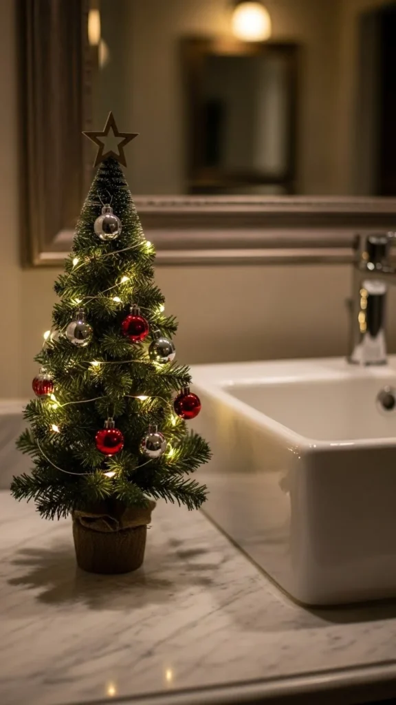 A mini Christmas tree instantly brings holiday charm to your bathroom. Choose a tiny tabletop tree that fits comfortably beside the sink or on a shelf. Decorate with mini ornaments, bows, or warm fairy lights. Keep the palette simple—gold, silver, or soft red—to avoid visual clutter in a small space. Place the tree in a ceramic mug, small basket, or soap dish for a fun, themed base. If your counter space is limited, position the tree on a windowsill or back ledge. This idea works well in guest bathrooms and powder rooms where visitors appreciate a festive touch.