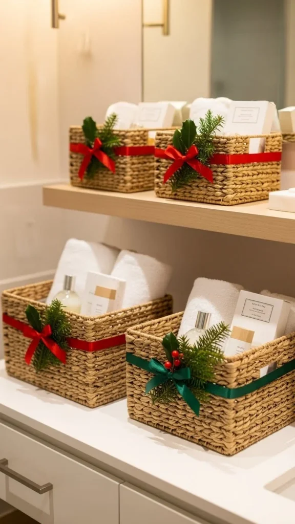 Add holiday charm to storage baskets by tying small ribbons or attaching tiny ornaments to the handles. Choose ribbon colours that match your bathroom palette. You can also tuck a sprig of greenery into each basket for extra detail. This idea works well in bathrooms with open shelving. It’s budget-friendly and makes the entire space feel coordinated.