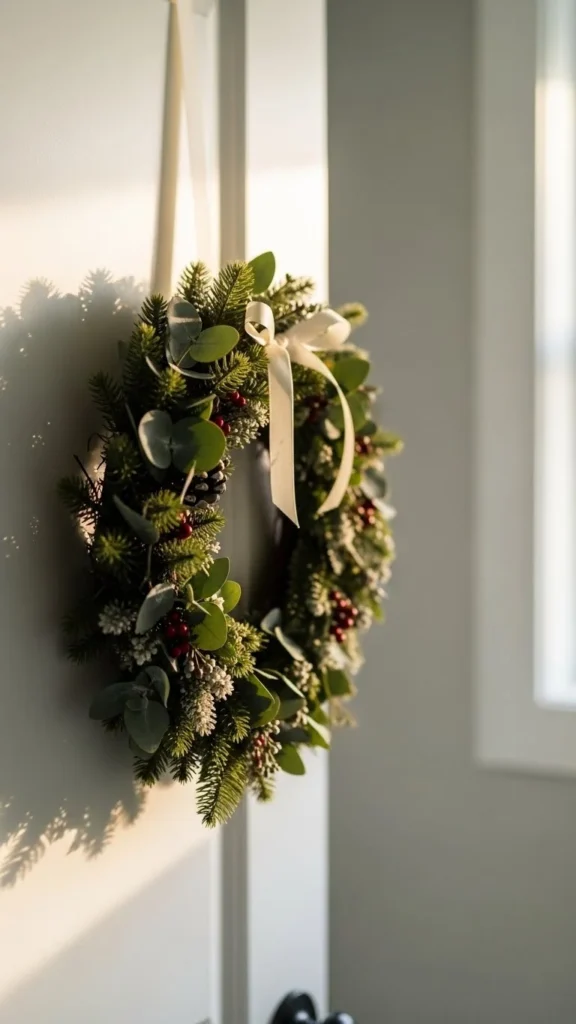 A mini wreath adds charm even before you enter the bathroom. Choose a wreath size that fits the door without overpowering it. Use greenery, berries, or simple ribbon. Hang the wreath with an over-the-door hook or command strip. This idea brings holiday warmth to the entire hallway and bathroom area.