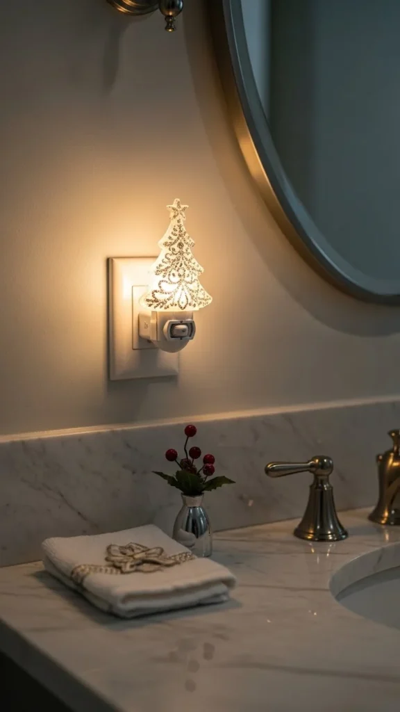 A Christmas night-light adds gentle glow and seasonal charm. Choose shapes like stars, trees, or snowflakes. Soft lighting helps the bathroom feel warm during evenings. This works especially well in homes with kids or guests because it adds comfort without turning on overhead lights.