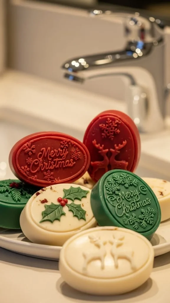 Decorative soap bars shaped like trees, snowflakes, or gingerbread add charm to your bathroom. Place them on a soap dish or in a small basket. Choose scents like pine, cinnamon, or peppermint. These soaps are pretty and functional, making them perfect for guest bathrooms. You can also wrap them with small ribbons for added detail.