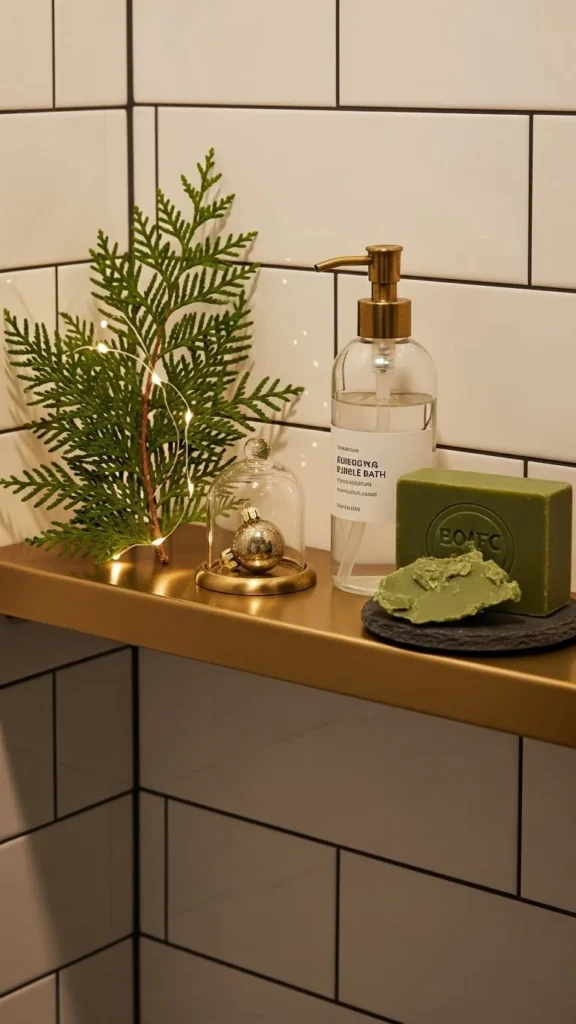Style your shower shelf with subtle holiday accents like waterproof ornaments or greenery tucked behind bottles. Keep things minimal so the space stays functional. Replace everyday bottles with holiday-scented options like pine or vanilla. This gives your shower a seasonal upgrade without heavy decor.