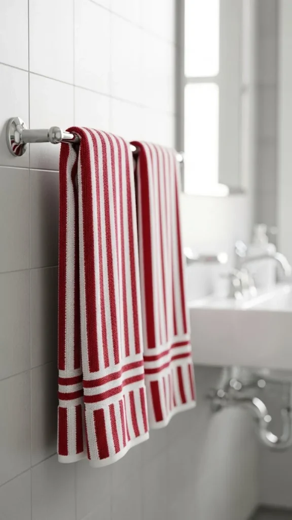 Red and white striped towels add a candy-cane feel. They’re simple, cheerful, and easy to pair with your existing decor. Hang them on the towel bar, roll them into a basket, or fold them neatly on a shelf. Keep other accents neutral to avoid visual clutter. This look works well in both small and large bathrooms.
