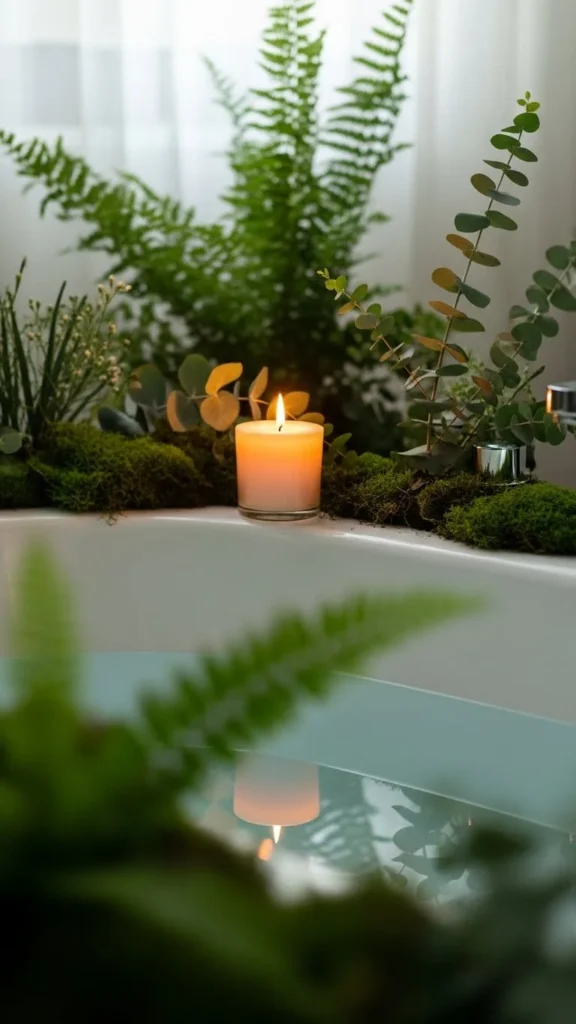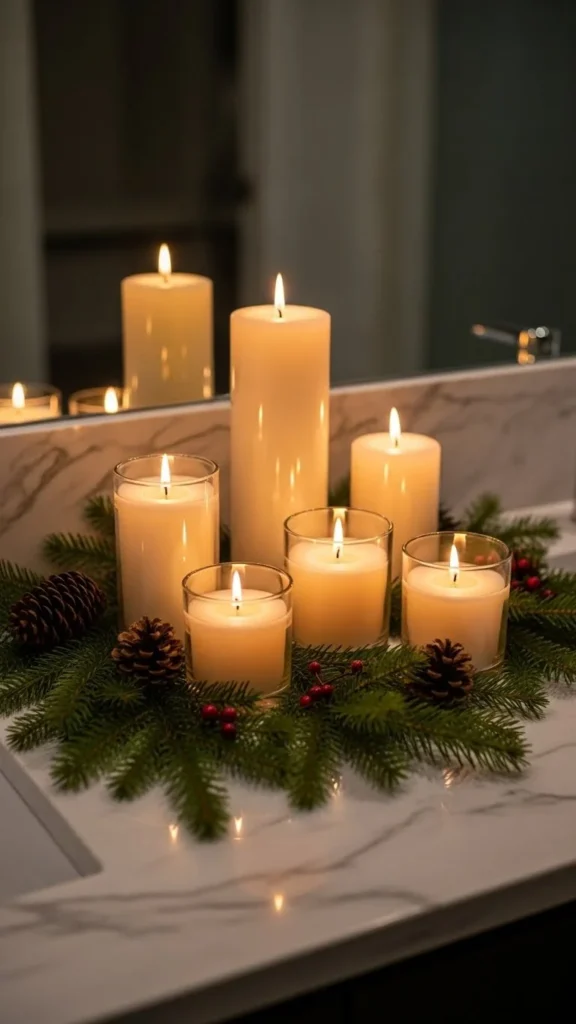 Add a festive candle to the edge of your tub during baths. Choose scents like pine, cinnamon, or sugar cookie. Place the candle in a protective holder and add greenery or berries nearby. The warm glow enhances the relaxing atmosphere and ties into the holiday spirit. Use flameless candles if you prefer extra safety.