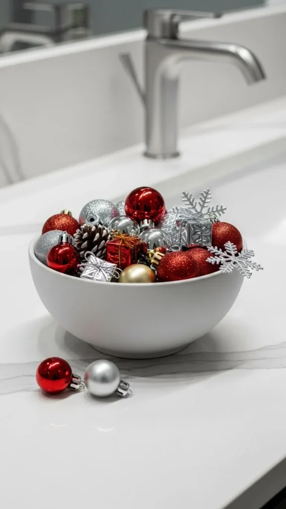 A bowl of small ornaments adds colour and seasonal charm. Choose a bowl that matches your bathroom’s colours. Fill it with ornaments in red, gold, silver, or white. Keep the palette simple for a clean look. Place the bowl near the sink, on a shelf, or on the toilet tank. This idea works well in tiny bathrooms where space is limited.