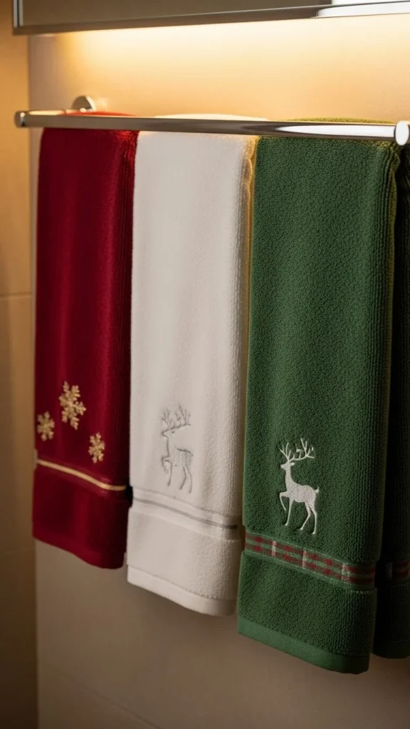 Holiday hand towels add instant seasonal personality. Choose towels with simple patterns like snowflakes, stripes, or Christmas trees. Avoid bold prints if you want a calm, refined look. Fold the towels neatly and hang them on the bar or roll them into a decorative basket near the sink. Keep your usual everyday towels stored away to maintain a clean, coordinated decor. This is one of the easiest ways to style your bathroom without buying many decorations. You can even layer a small festive towel over a plain white one for an effortless holiday accent.
