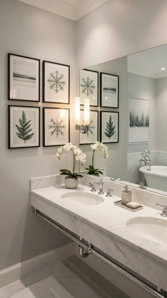 Switching your usual bathroom wall art for Christmas prints adds instant holiday charm. Choose simple designs like winter landscapes, trees, or minimal holiday quotes. Use frames that match your bathroom style—white, wood, or metallic. This idea is easy to change after the season. Printable art is an affordable option that still looks polished.