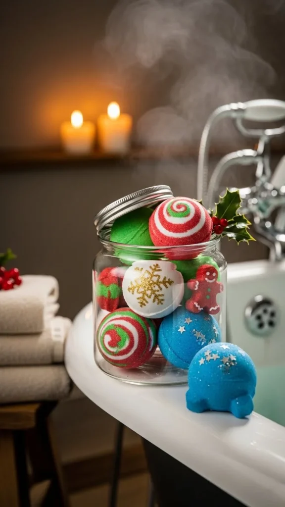 Fill a clear jar or vase with holiday-themed bath bombs. Choose scents like peppermint, pine, or vanilla. Display the jar on the edge of the tub or on a shelf. This adds colour and fragrance while being practical for bath lovers. Kids enjoy picking their favourite bomb, making it a fun addition for family homes.