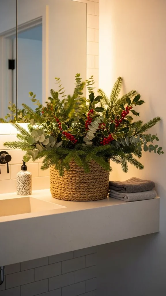 Place a basket of greenery under the sink for a subtle touch. Pine branches or eucalyptus look best. Add a ribbon to the basket for seasonal charm. This works especially well if your bathroom has open shelves. It’s a simple way to decorate without taking up counter space.