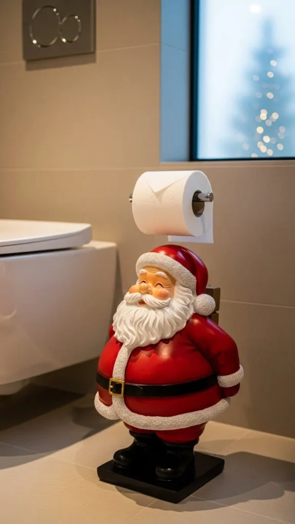 A themed toilet paper holder adds a fun element to your bathroom. Choose a Santa, reindeer, or snowman design. Keep the colours soft to avoid clashing with existing decor. This idea works especially well in family bathrooms or homes with kids. It adds holiday personality without taking up much space.