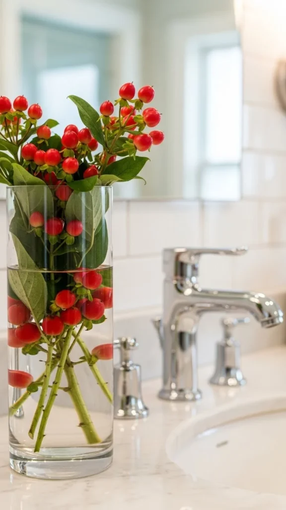A small vase with red berries adds a pop of colour. Place it on the counter or on a shelf. Pair the berries with greenery or keep them simple on their own. This look fits bathrooms that already have neutral tones. It’s inexpensive and easy to switch out after the season.
