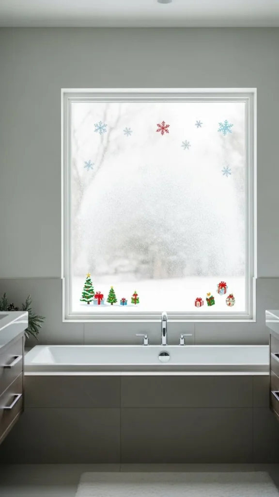 Use snow spray to create a frosted effect on the bathroom window. Add small decals like snowflakes or stars for a festive look. Keep the spray light so natural light still passes through. This is an easy way to decorate without taking up counter or shelf space. It looks especially magical in bathrooms with large windows.