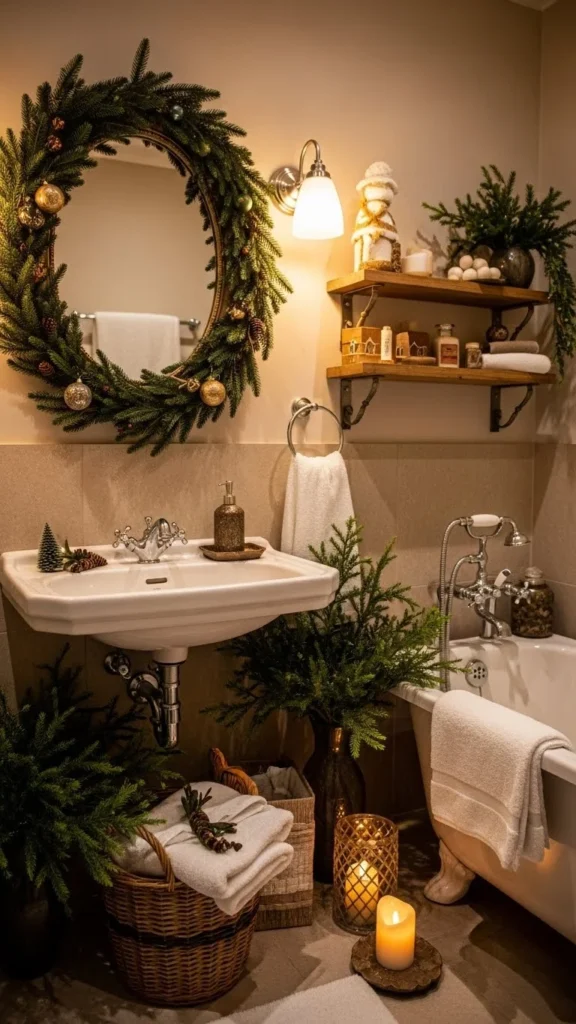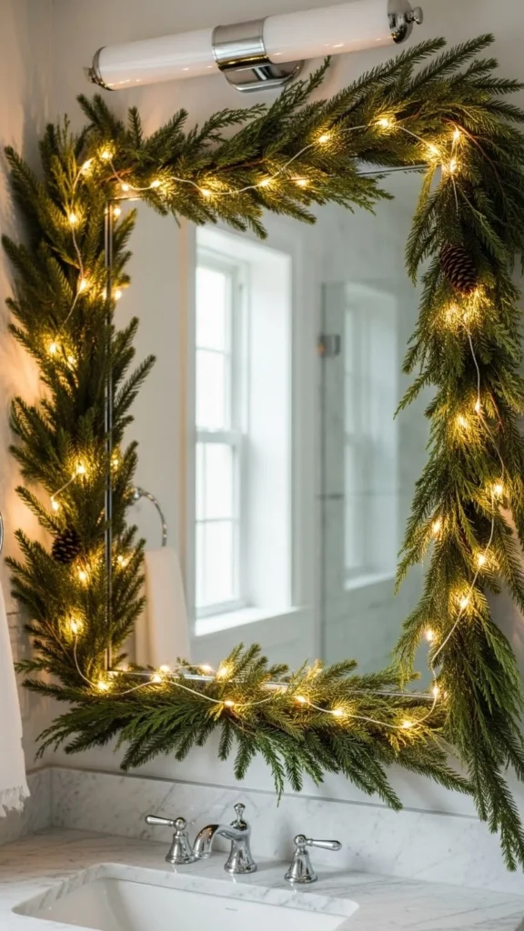 Draping greenery around the mirror brings life and warmth to your bathroom. Choose faux or real garland depending on your preference. If using real greenery, pine and eucalyptus work best since they last longer in humid spaces. Keep the garland lightweight so it hangs neatly without damaging the mirror. You can add a string of micro-lights for a soft glow. This idea looks especially beautiful during evenings when the bathroom lighting is gentle. It’s a simple touch that makes daily routines feel holiday-ready.