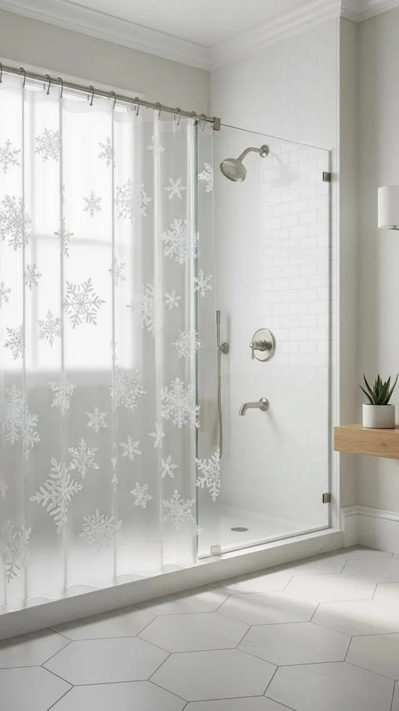 A snowflake shower curtain adds seasonal charm with very little effort. Choose a curtain with a soft pattern in white, silver, or pale blue. Avoid overly loud designs to keep the bathroom calm and inviting. Pair the curtain with matching bath mats or towels for a coordinated look. This is a great option for renters because you can switch it out easily after the season. It works especially well for bathrooms with minimal colour schemes.
