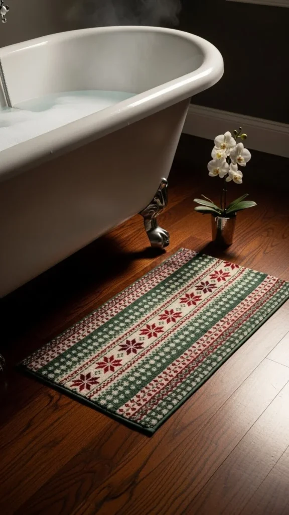 A festive bath mat adds comfort and colour. Choose small patterns like trees, holly, stars, or stripes. Keep the colours in line with your bathroom’s palette so the space doesn’t feel visually heavy. Pair the mat with matching towels or a small decor item for balance. This is an inexpensive way to add seasonal charm to your bathroom without changing much.