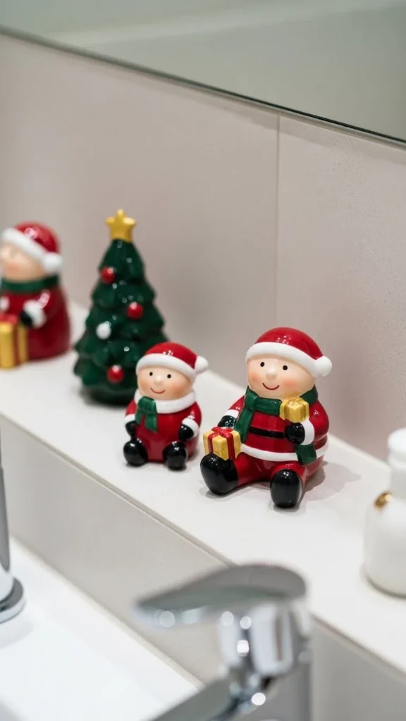 Small ceramic figurines—like trees, houses, or reindeer—look charming in bathrooms. Place them on shelves, the back of the toilet, or next to the sink. Choose a few pieces rather than filling every surface so the space stays tidy. White and gold figurines work well for a calm, elegant look. If your bathroom is playful, choose red or multicoloured pieces. This idea is easy to customise and works in both large and small bathrooms.