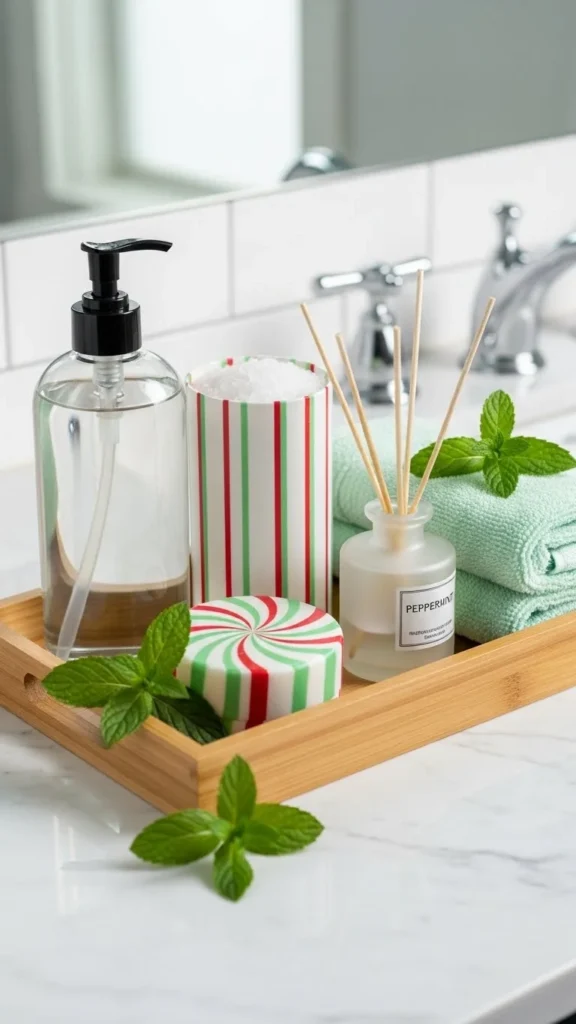Peppermint bath products create a fun Christmas display. Gather items like peppermint body wash, bath salts, lotions, and scrubs. Arrange them in a tray or basket to keep the space organised. Add a candy cane or small greenery sprig for a polished touch. This makes your bathroom smell festive and adds a playful look. It’s practical too—you’ll actually use the items.