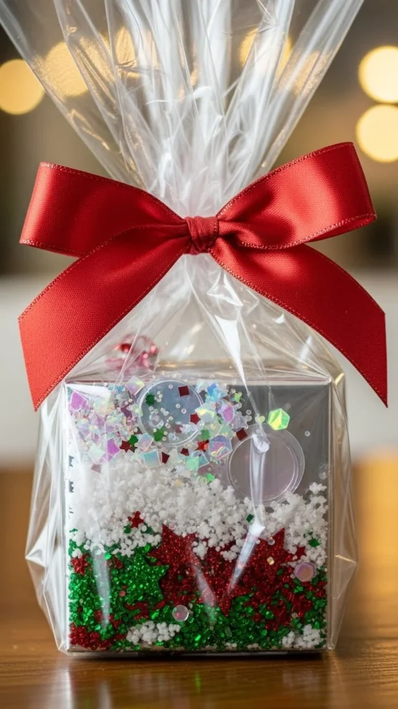 Clear cellophane is a modern, chic way to wrap holiday gifts while allowing the contents to be visible. Fill the cellophane with holiday-themed filler like faux snow, colorful confetti, or even candy canes for added seasonal charm. Tie it with a festive ribbon that matches the theme. This setup gives your gift a boutique feel and creates excitement for the recipient, as they can see part of the surprise inside.