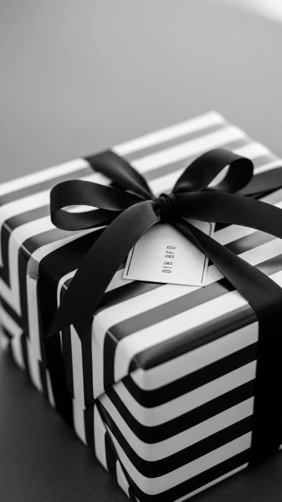 Monochrome black and white wrapping offers a sleek, modern aesthetic for your Christmas gifts. The bold black-and-white stripes create a sophisticated look, while the contrasting black ribbon adds depth. A minimalist tag or a simple sprig of greenery provides just the right finishing touch. This style works well for both contemporary and minimalist holiday settings, making it a versatile choice for any home décor.