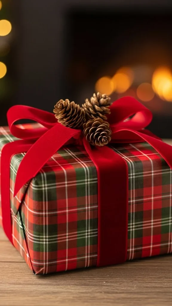 Plaid wrapping paper gives a cozy, festive feel to your gifts, and when paired with a red velvet ribbon, it brings a touch of luxury. The classic red, green, and black plaid pattern evokes a traditional holiday vibe, while the velvet ribbon adds depth and richness. Small pinecones or faux holly berries can be attached for extra charm. This setup works perfectly for a rustic or country-inspired holiday aesthetic.