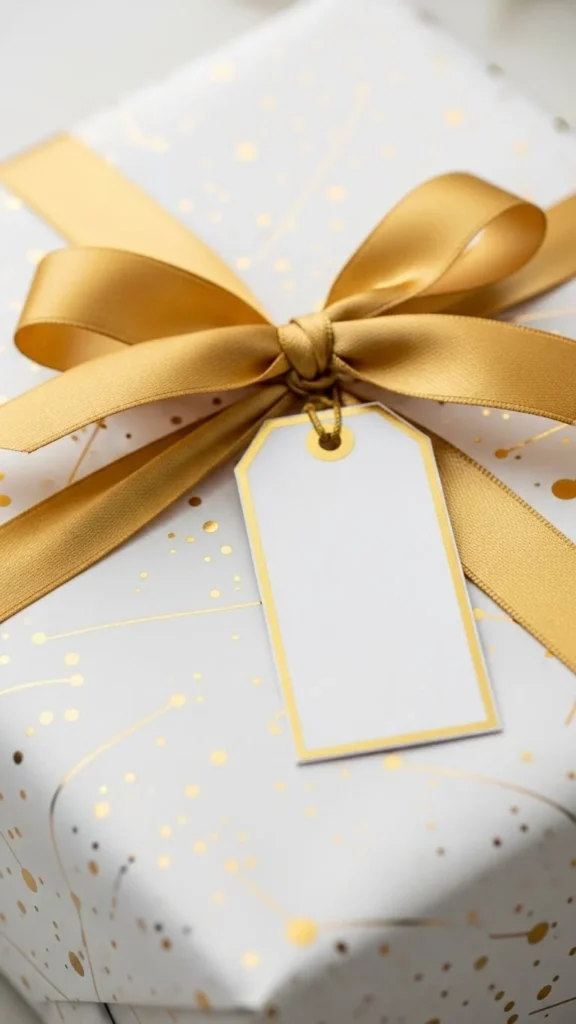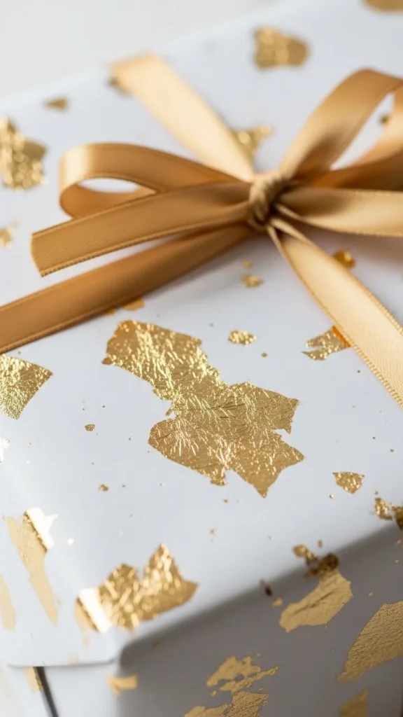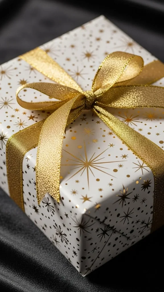 Gold foil accents on white paper create a clean, elegant, and festive look. The bright white background highlights the shimmering gold details, making the wrapping feel luxurious. Pair the paper with a gold ribbon and a matching gift tag for a coordinated look. This style adds a refined touch to any gift, making it a perfect choice for upscale or formal holiday settings. The simple elegance of this setup is sure to impress.
