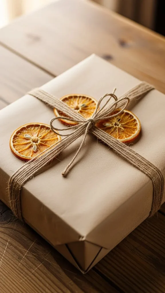 Kraft paper is an eco-friendly choice for wrapping gifts, and when paired with dried orange slices, it creates a warm, rustic holiday look. The natural brown paper provides a beautiful, earthy backdrop, while the orange slices add a touch of seasonal color and fragrance. Secure the paper with twine or natural string for a simple, charming presentation. This wrapping style is perfect for those who want to keep their holiday décor eco-conscious and stylish.