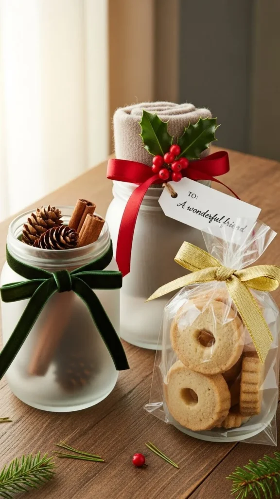 Frosted glass jars make unique and stylish gift packaging, perfect for smaller presents like bath products, candies, or jewelry. The frosted glass adds a touch of elegance, and the transparent surface allows the gift inside to show through. Tie a festive ribbon around the lid and add small holiday details like sprigs of holly or a small ornament. This creative packaging not only looks chic but also makes for a functional gift container that the recipient can reuse.