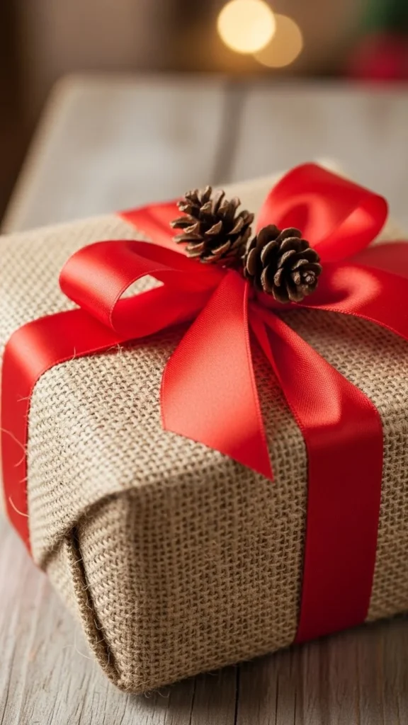 Burlap adds a rustic charm to your holiday gifts, and when paired with a rich red satin ribbon, it exudes a cozy, festive feel. This combination brings warmth and texture to the gift wrapping, making it perfect for a farmhouse or traditional Christmas aesthetic. Adding a pinecone or small bundle of twigs completes the rustic look. This simple yet elegant wrapping option is both stylish and budget-friendly.