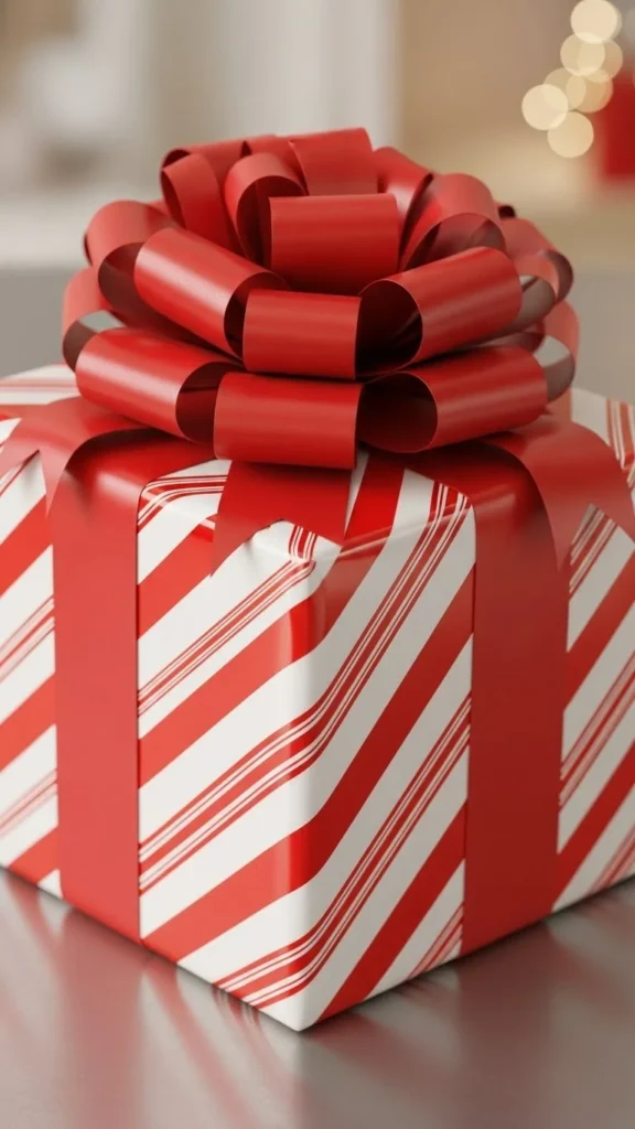 Candy cane-striped wrapping paper adds a playful, festive vibe to your Christmas gifts. The bold red and white stripes bring to mind classic holiday traditions, and when paired with a red satin bow, the gift feels both fun and luxurious. This wrapping style works well for both kids and adults, adding an instant holiday feel to any gift. For a twist, add a small gift tag shaped like a candy cane for a thematic touch.