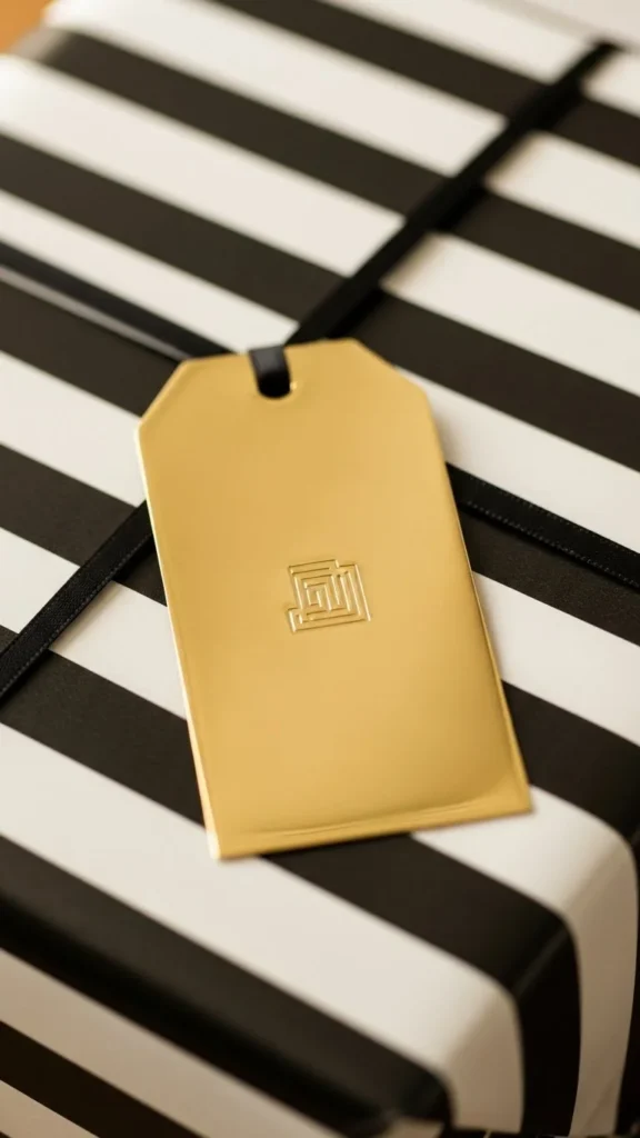 Black and white striped wrapping paper is a modern, stylish choice for your holiday gifts. The bold stripes create a striking contrast, while the gold foil gift tag adds a touch of glamour. This wrapping style feels sophisticated and contemporary, perfect for anyone who prefers a minimalist aesthetic with a touch of luxury. Complete the look with a simple black ribbon or twine for a cohesive, chic presentation.