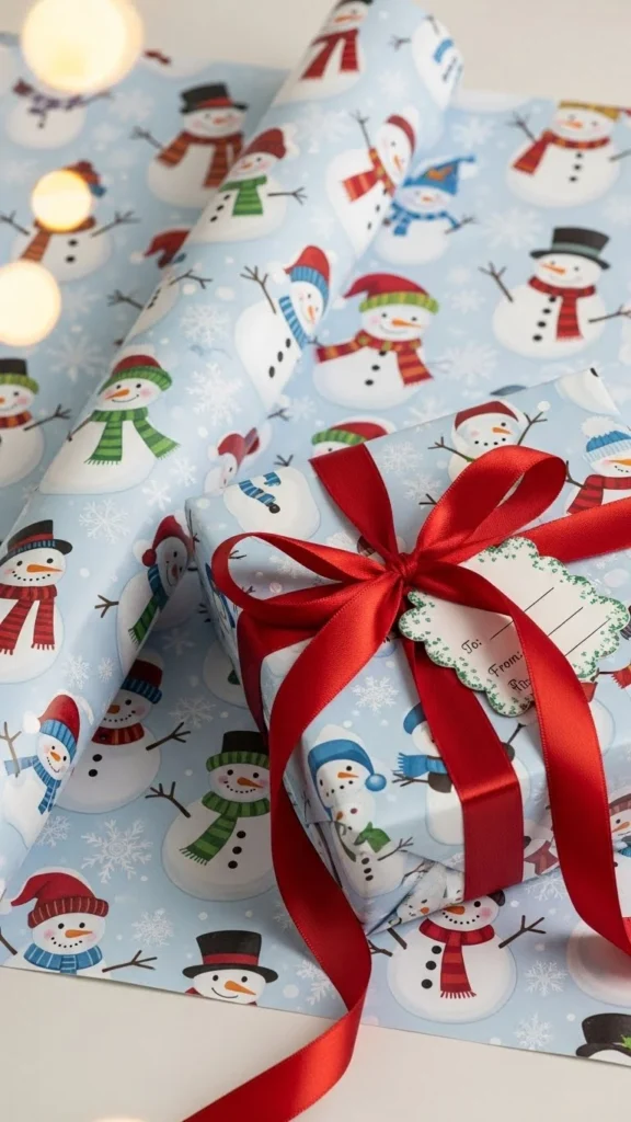 Whimsical snowman wrapping paper adds a fun, cheerful vibe to your holiday gifts. The cute snowman illustrations bring a touch of playfulness to the wrapping, making it perfect for children or anyone who enjoys a lighthearted holiday season. Add a bright red satin ribbon for contrast and a festive gift tag to complete the look. This wrapping idea brings joy and laughter, making it a great choice for holiday parties or family gatherings.