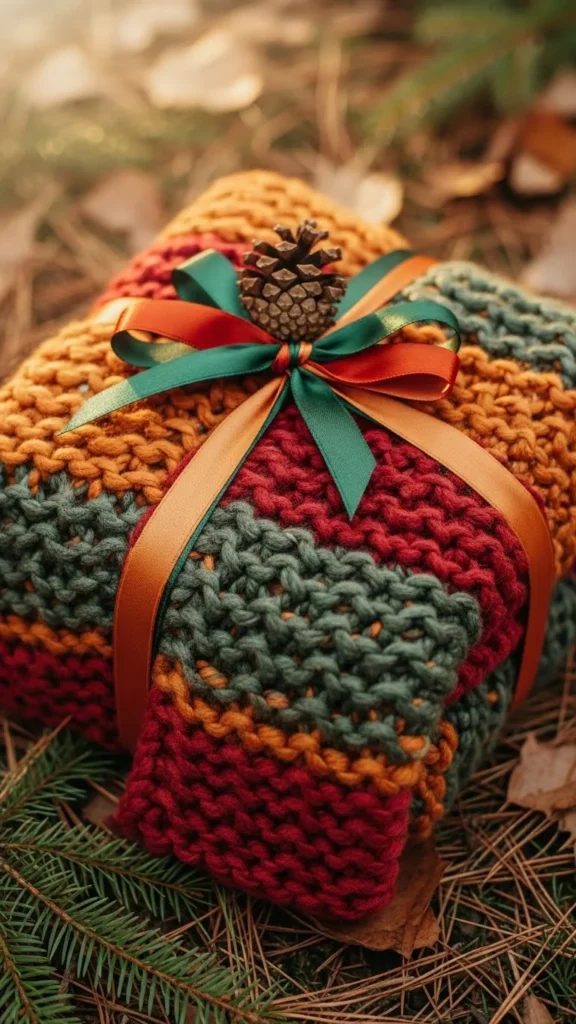 Using a knit scarf as gift wrap adds a cozy, tactile element to your holiday presents. Choose a scarf in seasonal colors like red, green, or white, and tie it around the gift with a festive ribbon. The soft, knitted texture gives the gift a homey, warm feel. For a small holiday touch, add a pinecone or tiny ornament to the bow. This wrapping option is perfect for scarves, mittens, or any gift you want to present in a personal, cozy way.