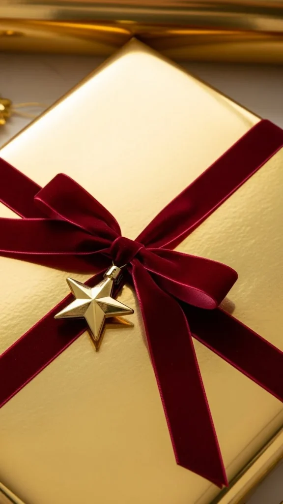 Metallic paper is the ultimate choice for a high-end look, and when paired with a luxurious velvet ribbon, it creates a truly boutique-style gift presentation. The rich texture of the velvet ribbon contrasts beautifully with the sleek metallic paper, adding depth and warmth. To complete the look, attach a small gold star or bauble for a touch of festive glamour. This wrapping style is perfect for those who love a glamorous and shiny holiday aesthetic.