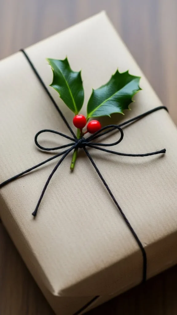 Kraft paper offers a minimalist, eco-friendly option for gift wrapping, while black twine adds a sleek, modern touch. This combination feels effortless yet polished. Add a sprig of holly or a tiny pinecone to bring in a natural holiday element. This style is perfect for those looking to create a simple, understated look while still adding personality to their gift presentation. It’s a great option for a casual, earthy holiday aesthetic.