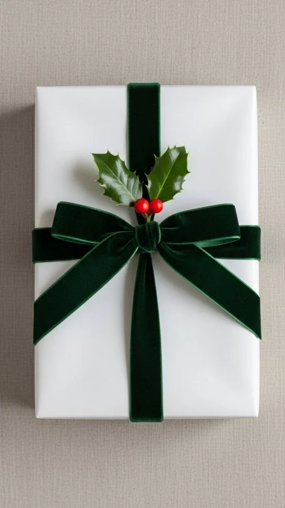 White wrapping paper creates a fresh, modern base, allowing your decorations to stand out. Pair it with a soft green velvet ribbon for a refined, elegant look. Adding a sprig of holly or pine provides a natural, festive touch that feels organic and seasonal. This minimalist yet luxurious style works well for any occasion, and it’s an especially chic choice for Christmas gifts.