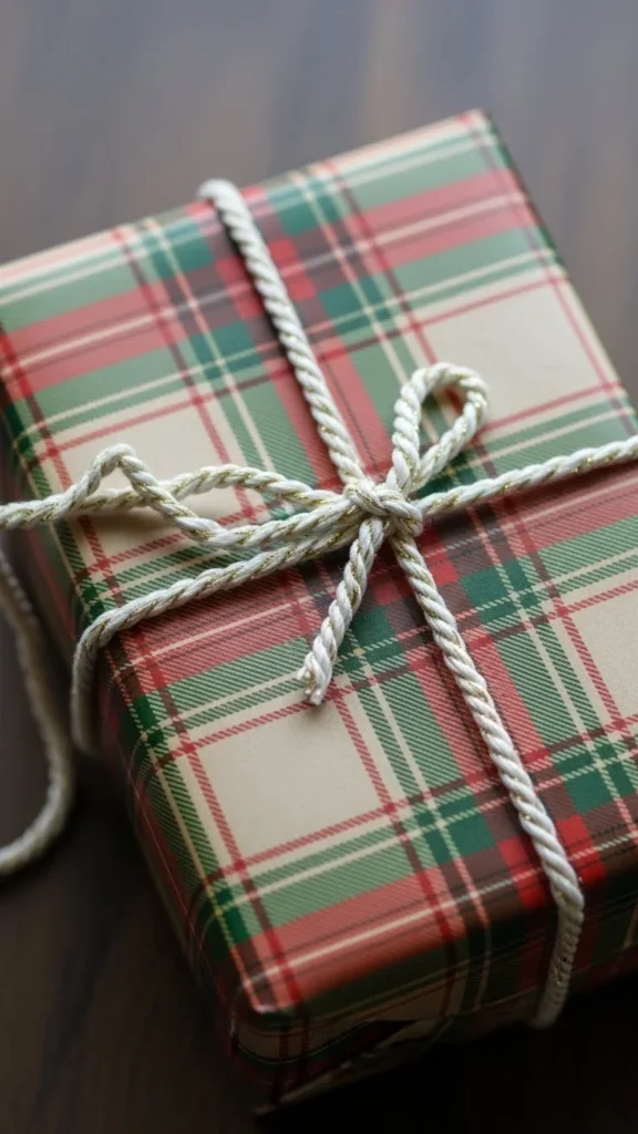 Plaid wrapping paper brings a timeless, cozy touch to your Christmas gifts. The bold checkered pattern in classic colors like red, green, and black pairs beautifully with twisted yarn, adding texture and personality. You can keep it rustic with simple twine or opt for a shiny yarn for a more festive look. This setup evokes a warm, nostalgic feel, making it perfect for the holiday season.