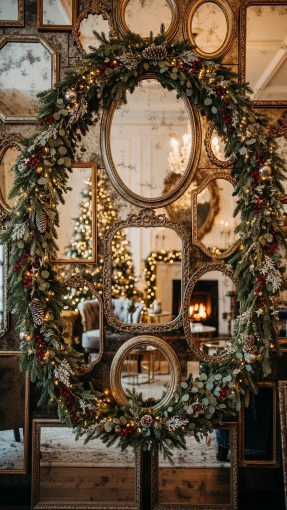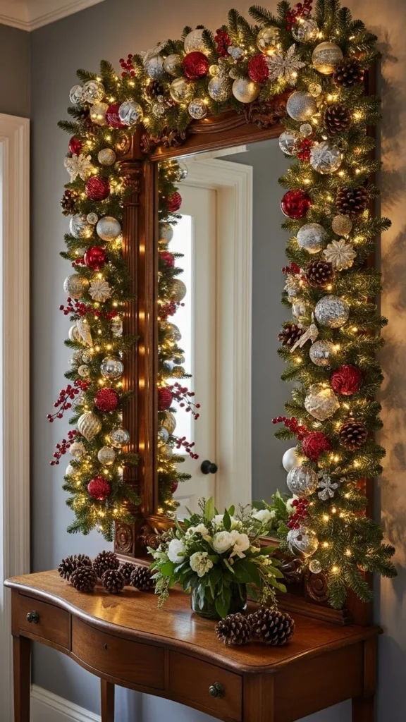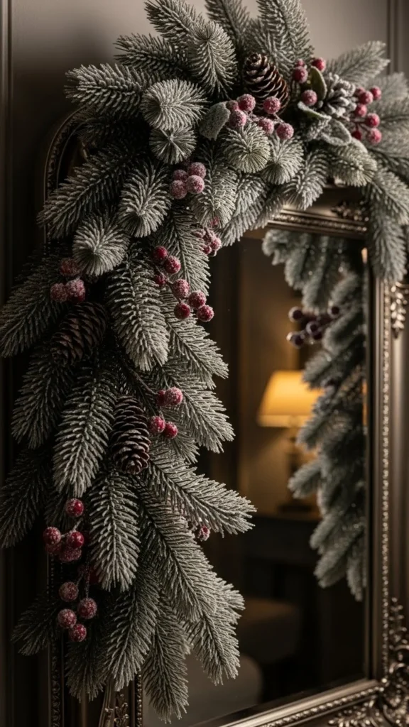 A frosted pine garland adds a wintery touch to your mirror. Wrap it loosely around the frame so the snowy texture stands out. Add a few pinecones or white berries for detail. This idea pairs well with neutral Christmas themes. For a DIY version, spray artificial snow onto a regular garland and let it dry outside. Place candles or lights near the mirror so the frosted branches reflect softly. It works well above mantels or in calm bedroom settings where you want a gentle holiday feel.