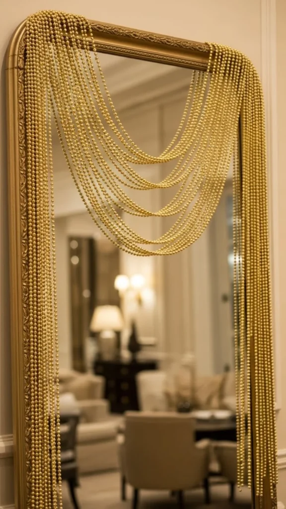 Gold bead garlands add shine without feeling heavy. Drape them across the top of the mirror and let them fall loosely along the sides. Mix short and long strands for texture. This idea works nicely in dining rooms because the gold reflects well under warm lighting. If you want extra detail, add one or two red bows where the garland dips. This style pairs well with classic Christmas themes and gives your mirror a polished look.