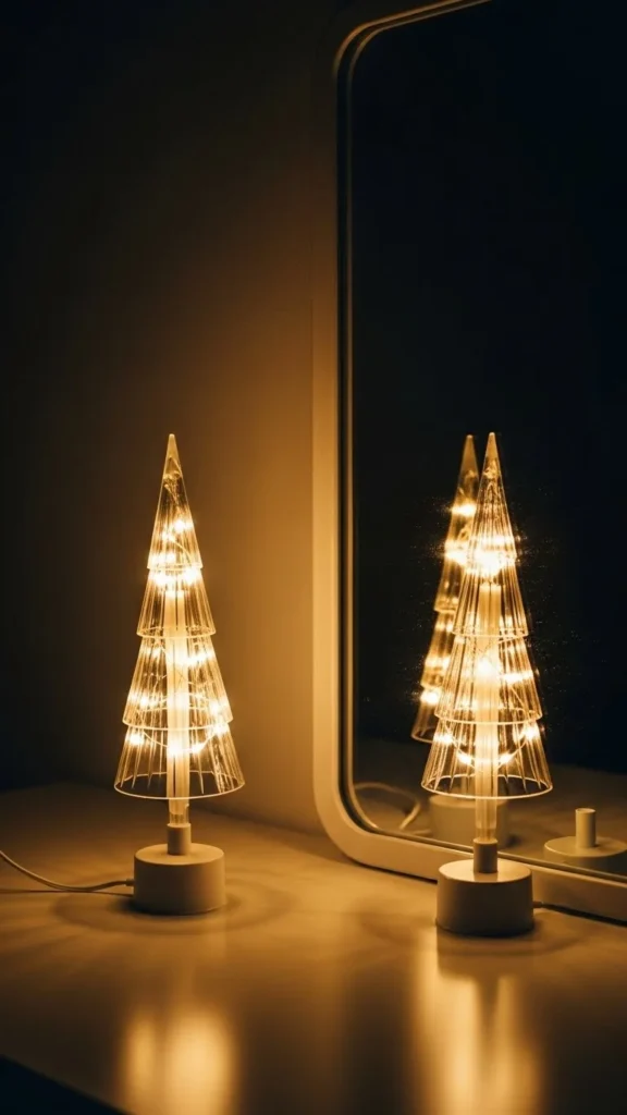 Place two mini LED trees on each side of your mirror to frame it with soft light. Choose matching trees to keep the setup balanced. This idea works well on consoles, buffets, and mantels. If the trees feel too tall, move them slightly outward to widen the visual space. Add small ornaments or ribbon that match your colour theme. Battery-powered trees keep the area clean without cords. This creates a warm, welcoming glow and works for both large and small mirrors.