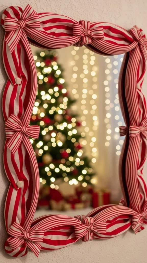 Wrap the mirror frame with candy cane striped ribbon for a playful holiday look. Start at the top corner and wrap diagonally, spacing the ribbon evenly. Secure it with double-sided tape. This works well in kitchens, kids’ rooms, and casual living rooms. For a cleaner look, wrap only the sides instead of the whole frame. Pair the mirror with peppermint-scented candles or small red accents nearby. This idea is affordable and adds bright, cheerful colour.