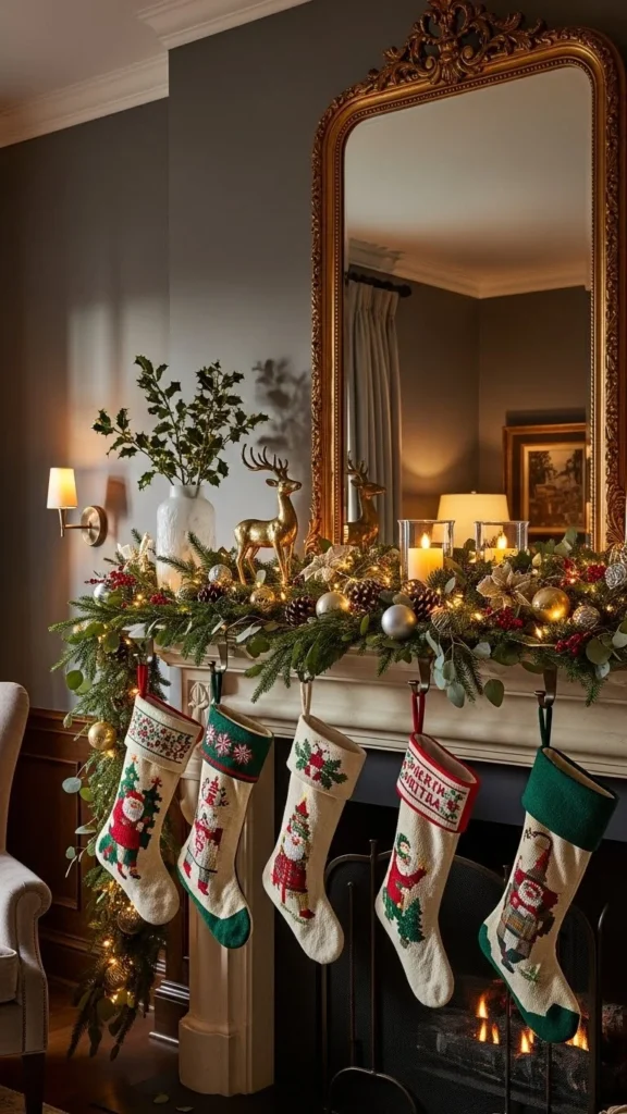 If your mirror sits above a mantel, use the space to build a full Christmas display. Hang stockings evenly across the mantel. Add a garland, candles, and ornaments to frame the bottom of the mirror. Keep taller items at the ends and shorter ones in the middle so the reflection stays open. This setup creates a traditional holiday look. Use matching stocking holders to keep the design tidy. The mirror reflects the whole scene, making the room feel brighter and more inviting.