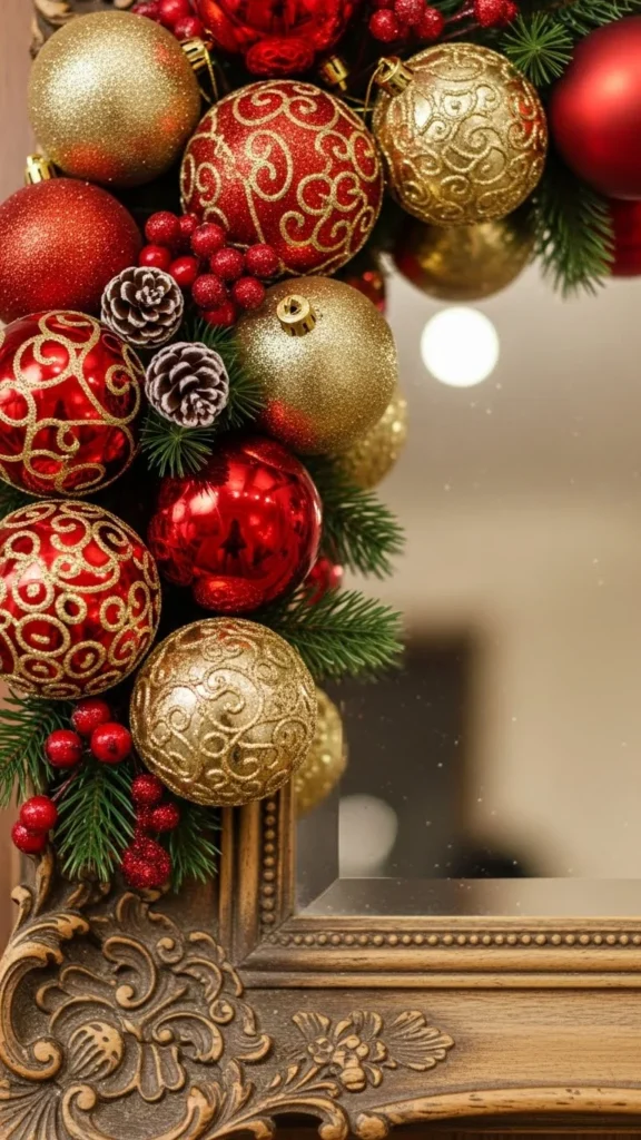 Hanging ornaments from ribbon strands gives your mirror playful movement and colour. Use three to five ornaments in matching colours for a balanced look. Cut ribbons at different lengths so the ornaments hang at staggered heights. Secure the ribbons at the back of the frame with tape or hooks. Use lightweight ornaments so they don’t pull. This idea works especially well above consoles and buffets. It’s a great way to repurpose extra ornaments without needing a tree.