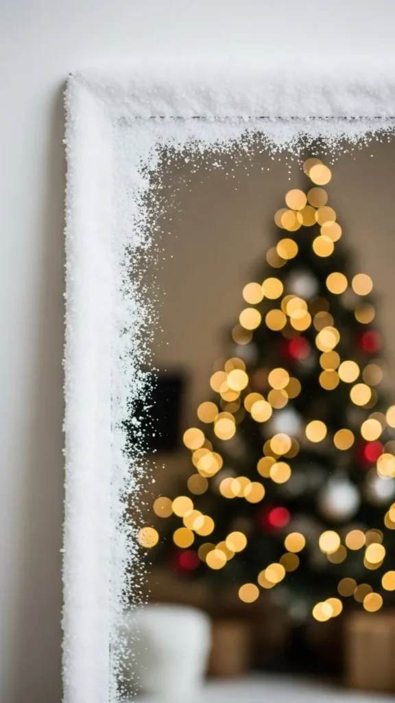 Use frosted window spray to give your mirror a snowy border. Lightly spray the edges and leave the centre clear so the reflection stays visible. This creates a wintery frame that looks soft and cosy. If you want a DIY stencil, cut snow shapes from paper and spray around them. The spray wipes off easily after the holidays. This idea pairs well with warm lights and red or silver accents. It’s affordable and works on any mirror size.
