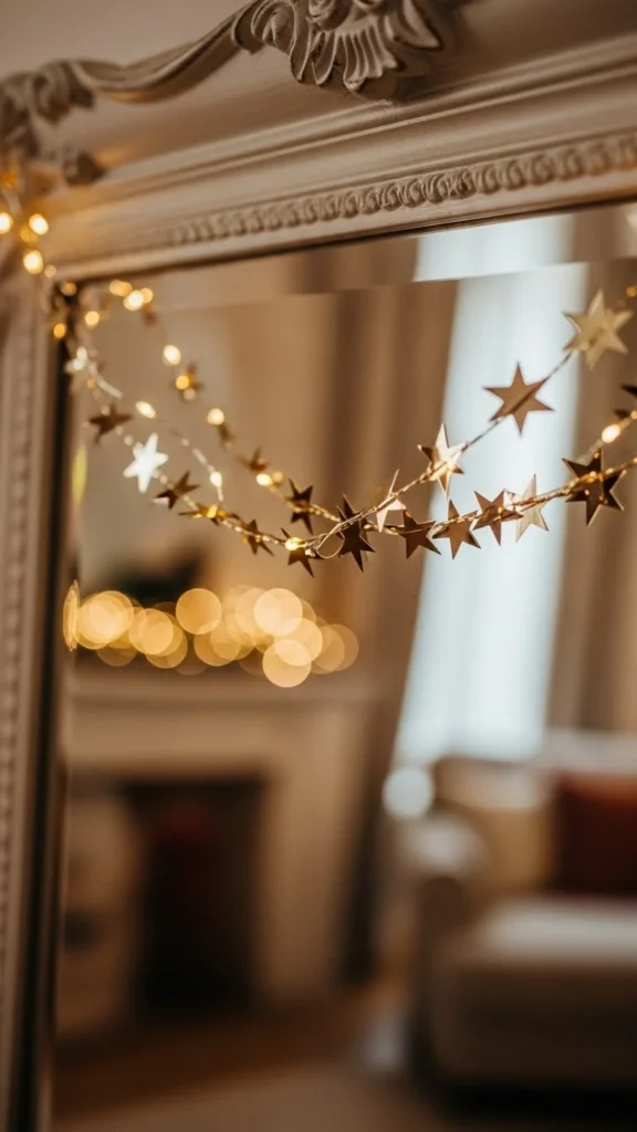 A gold star garland brings shine and movement to your mirror. Drape it across the top and let the ends fall down each side. Choose small stars for a subtle look or larger ones if you want more impact. Use clear hooks to keep the garland in place. This idea works best in bedrooms or modern living rooms. Pair it with warm lights nearby so the stars sparkle when reflected.