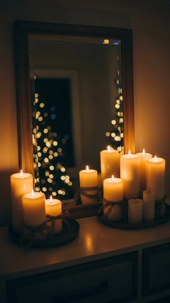 Candles create a warm glow that reflects beautifully in mirrors. Use candles of different heights and place them evenly around the mirror. Choose red, gold, or white candles to match your theme. Use LED flameless candles if you prefer something safer. Add a few evergreen sprigs or berries around the bases. The reflection multiplies the candlelight, making the room feel cosy and inviting. This setup works especially well for evening gatherings.