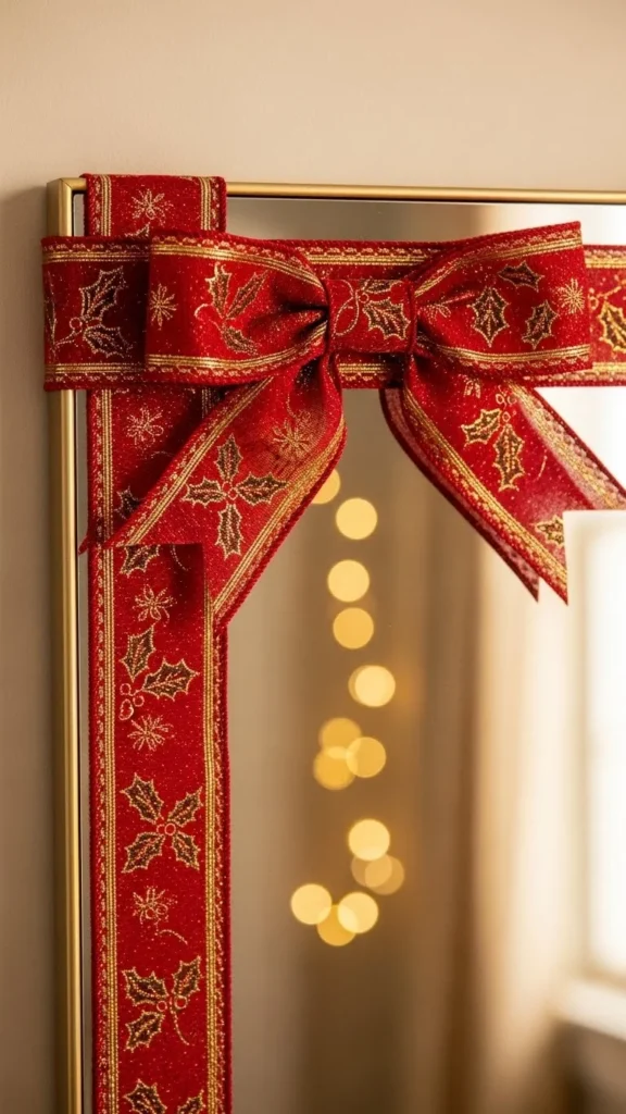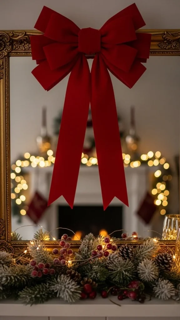 A large red bow makes a bold statement with minimal effort. Choose velvet for a richer look. Place the bow at the top centre of the mirror and let the tails hang slightly along the sides. If you want a custom look, layer two ribbons—one matte and one satin—to create depth. This idea works well for entryway and mantel mirrors because it draws attention upward. For a small mirror, pick a medium-sized bow so the scale feels balanced. It’s simple, affordable, and instantly festive.