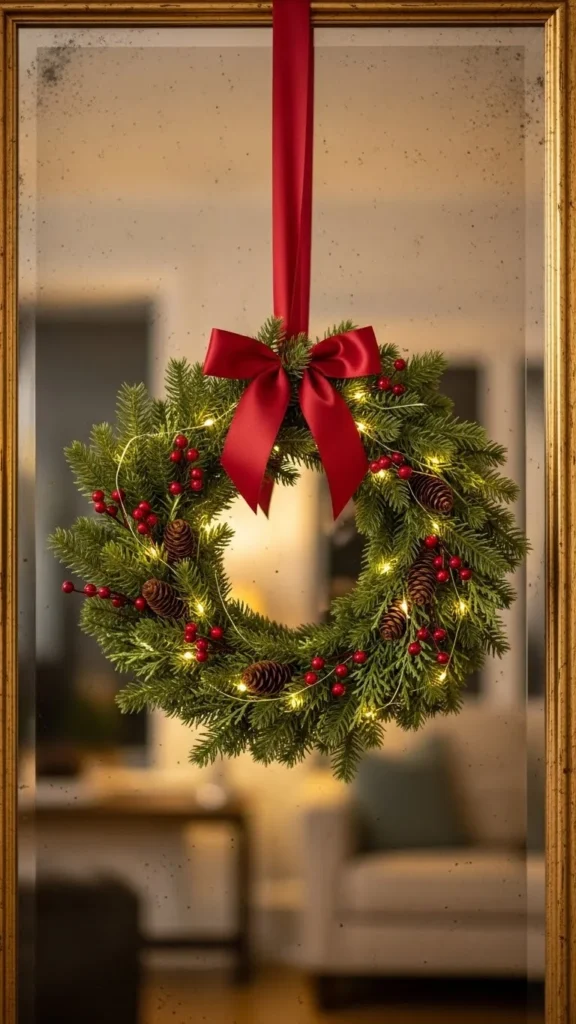 Hanging a mini wreath in the centre of a mirror adds shape and texture without blocking too much reflection. Use a satin or velvet ribbon to secure the wreath over the top of the frame. Keep the wreath simple with greenery or add small ornaments for colour. This idea works well in dining rooms and hallways. It’s also a good budget-friendly option because small wreaths are inexpensive and easy to DIY using leftover branches. If your mirror is large, use two or three small wreaths for a balanced arrangement.