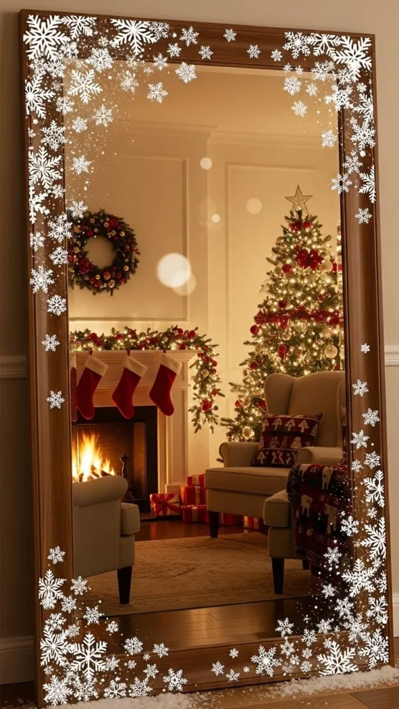 Snowflake decals give your mirror a soft winter feel without commitment. They’re easy to apply and peel off cleanly after the holidays. Arrange them around the edges so they frame the reflection. Use larger decals on the corners and smaller ones between for balance. If you prefer a DIY version, cut snowflakes out of white vinyl or use static cling sheets. Pair the mirror with candles or lights nearby so the snowflakes glow softly. This idea works especially well for kids’ rooms, bathrooms, and small hallways.
