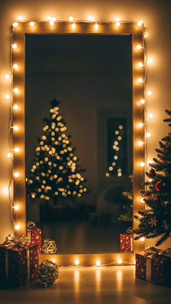 Bordering a mirror with fairy lights adds gentle warmth to the whole room. Use warm white lights for a soft look. Attach them around the frame using clear clips so the wire stays discreet. This works well for both classic and modern spaces. The lights reflect in the mirror, making the display appear brighter. For a quick upgrade, choose battery-powered lights to avoid visible cords. Try using twinkle-mode lights for subtle movement. This idea works especially well in bedrooms and living rooms where you want a calm holiday atmosphere.