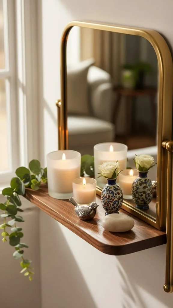 If your mirror has a shelf, it becomes an easy styling spot. Add a few candles, a small garland, and two or three ornaments for balance. Keep the items low so they don’t block the mirror. Use symmetry if you want a tidy look or mix shapes for a relaxed one. This works well in bathrooms, entryways, and bedrooms. If you want a budget option, reuse small decor pieces from other rooms. The reflection doubles the display, making it appear fuller.
